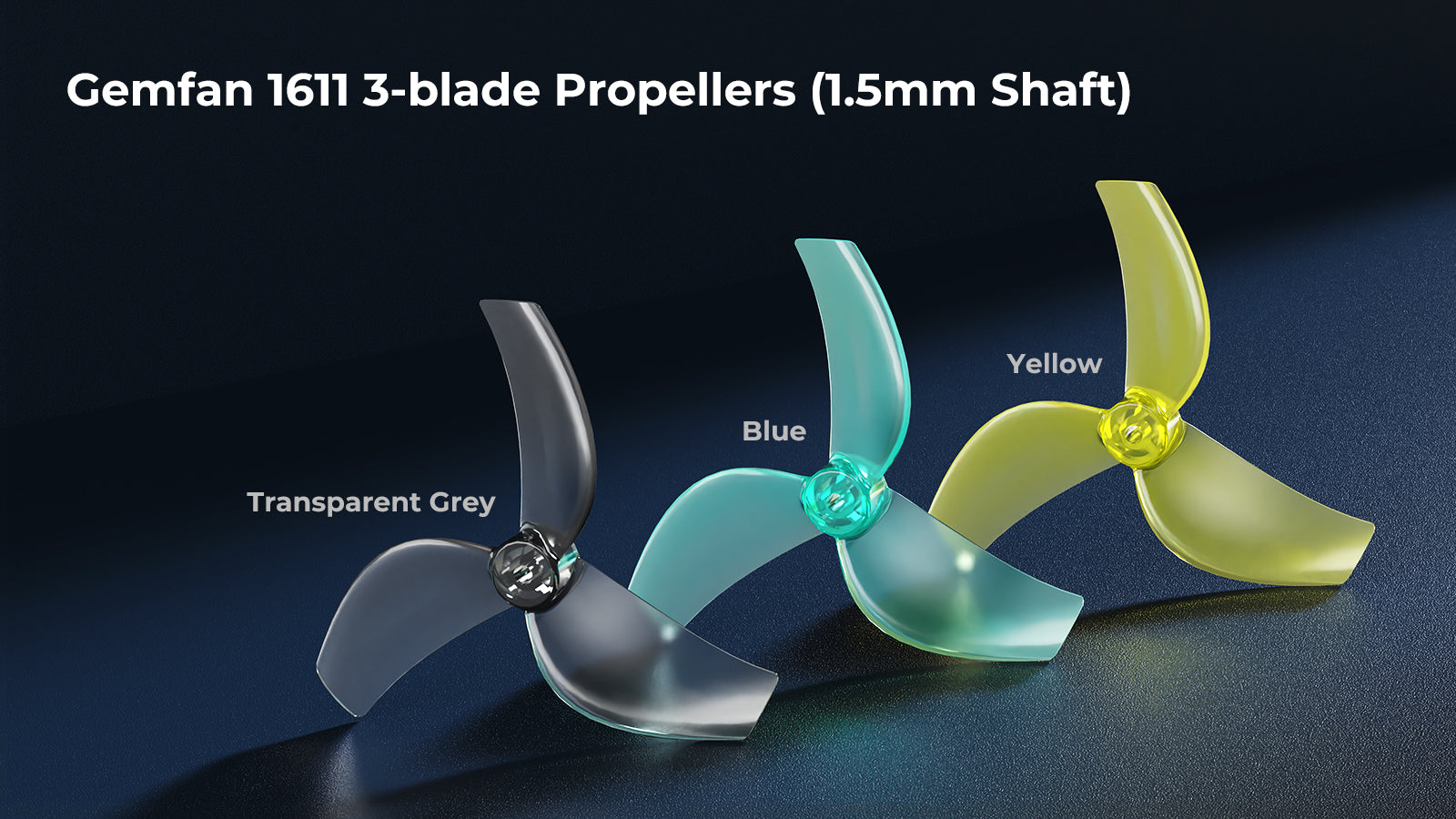 „Gemfan 1611” trijų menčių propeleriai pagaminti iš patvarios PC medžiagos, todėl puikiai suderina tvirtumą ir lengvumą.