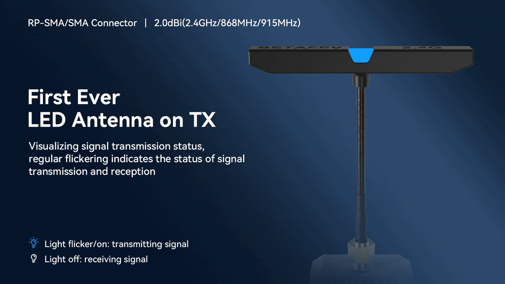 Naujoviška T-LED antena su mirksinčiu dažniu, rodančiu signalo perdavimą ir modulio prijungimo būseną. Iki 2 W galios antena užtikrina stabilų ryšį FPV lenktynėms, tolimiems skrydžiams ir profesionaliam fotografavimui.