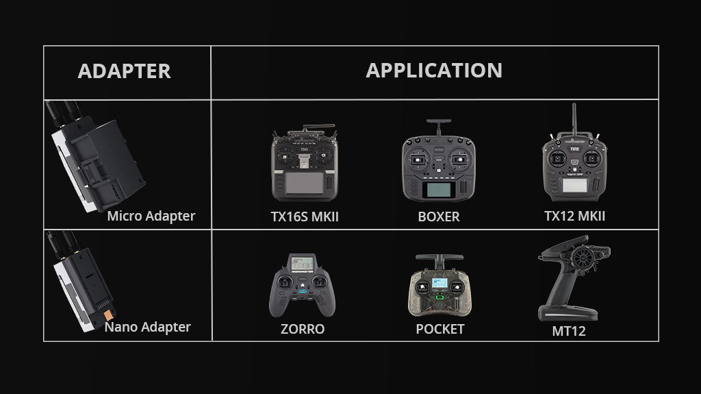 Suderinamas su 2,4 GHz + 900 MHz dviejų dažnių (Gem-X) „ExpressLRS” imtuvais.