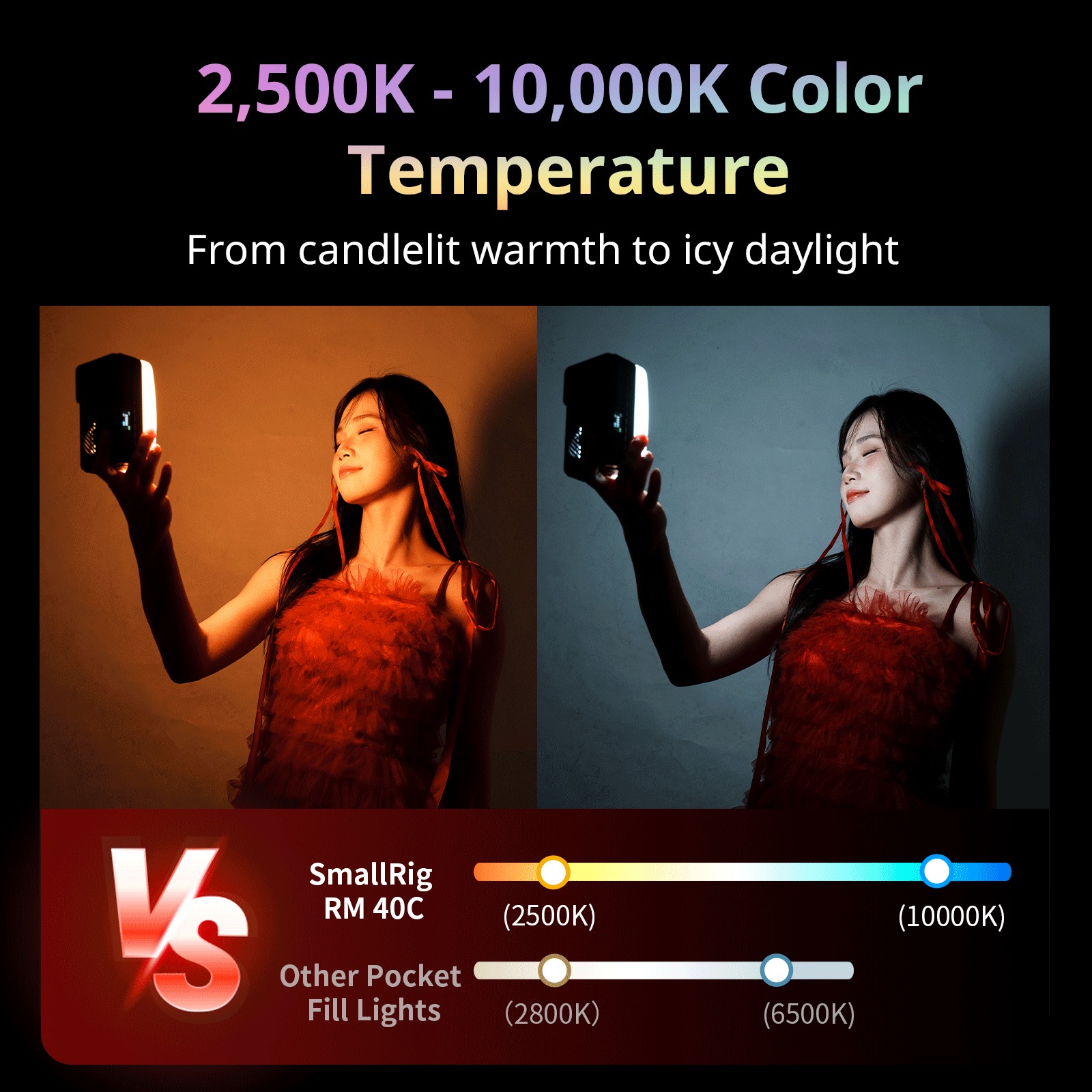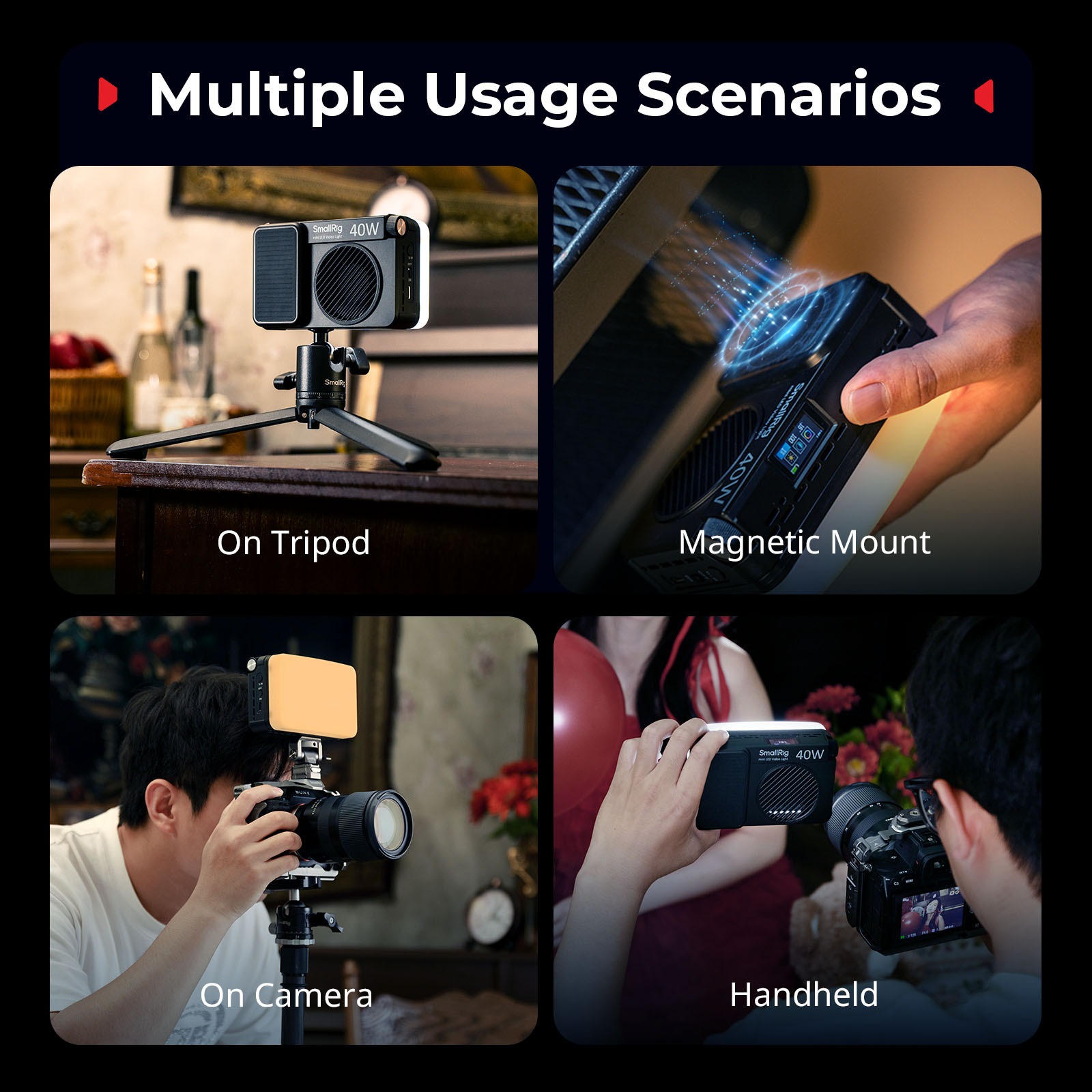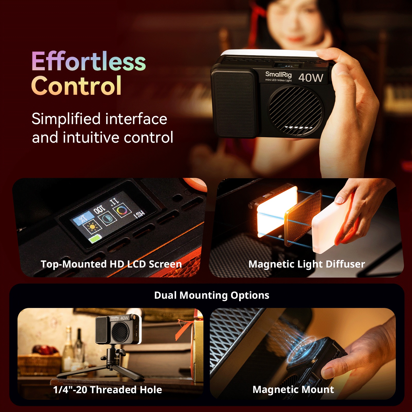 Kompaktiškas 40 W galios sprendimas mobiliosioms filmavimo aplinkoms: Užtikrina studijos lygio apšvietimą (4 670 liuksų @ 1 m) nešiojamoje konstrukcijoje (128 × 80 × 32 mm, 302 g), idealiai tinka interviu, produktų fotografijai ar vlogų filmavimui vietoje.